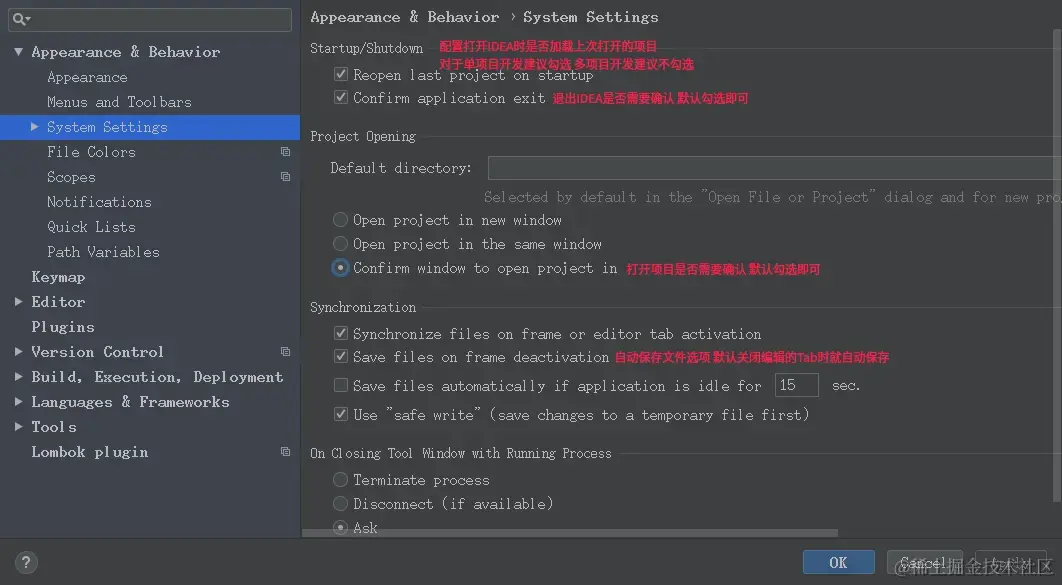 配置打开或者退出IDEA编辑器的行为,在配置界面的