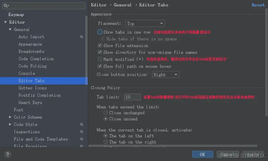 Editor | General |Editor Tabs下配置,取消如下的勾选项即可。