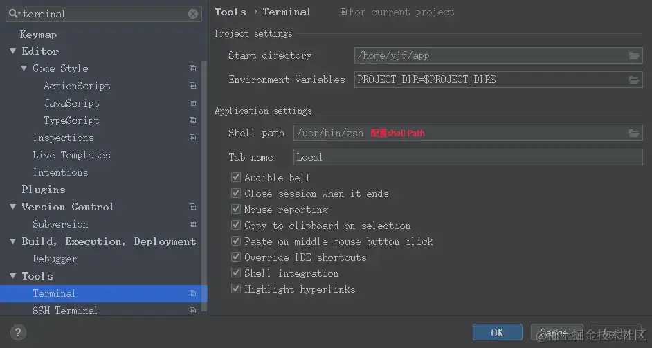 Ctrl+Alt+S后在配置界面中选择Tools | Terminal进行配置。