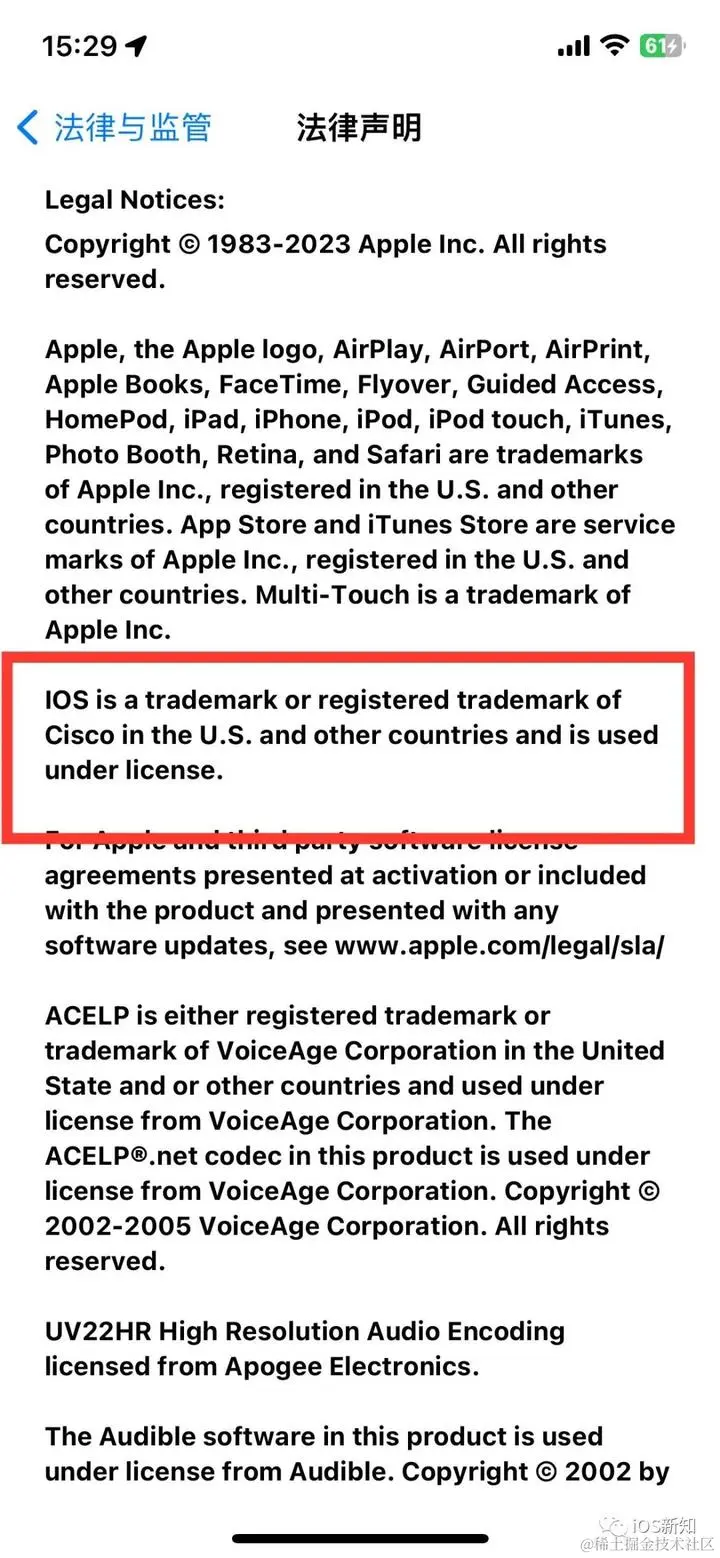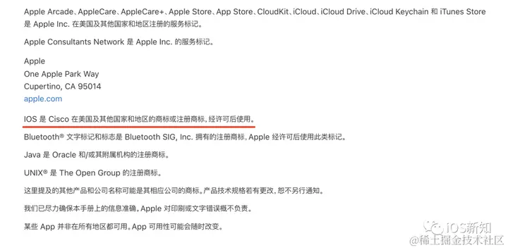 这在每一部 iPhone 的隐私条款中都有提到,可以打开 系统设置 -> 通用 -> 法律与监管 -> 法律声明,然后就可以看到针对 IOS 这个商标的描述(注意这里 IOS 的 i 是大写的)。