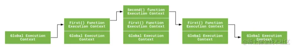 - 当first()函数内部调用 second函数时,同样的创建并且压入栈。当second()函数调用完毕输出b,它的执行上下文会从当前栈弹出,并且控制流程到达下一个执行上下文,即first()函数的执行上下文