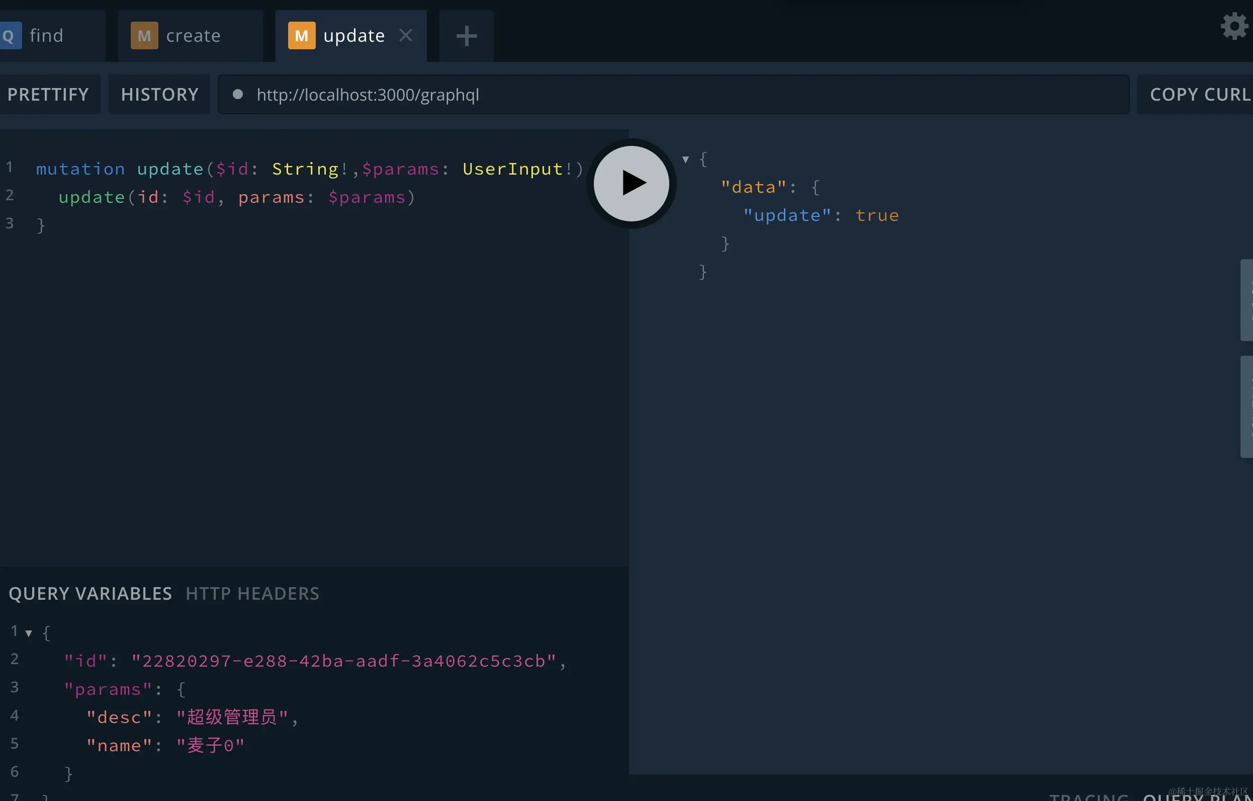 $id 和 $params: 这是通过 Mutation 操作的参数传递给后端的实际值。id 输入参数,params 输入参数。