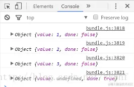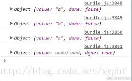 这时我们发现打印出了a,b,c已经最后一次的undefined,以及done的值变成true,证明这次的变量完成了