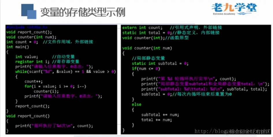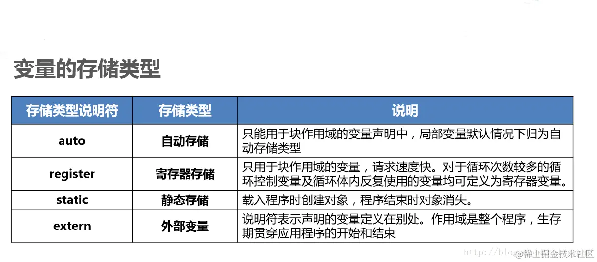 变量的存储方式:动态存储(自动、寄存器)、静态存储(静态和外部)