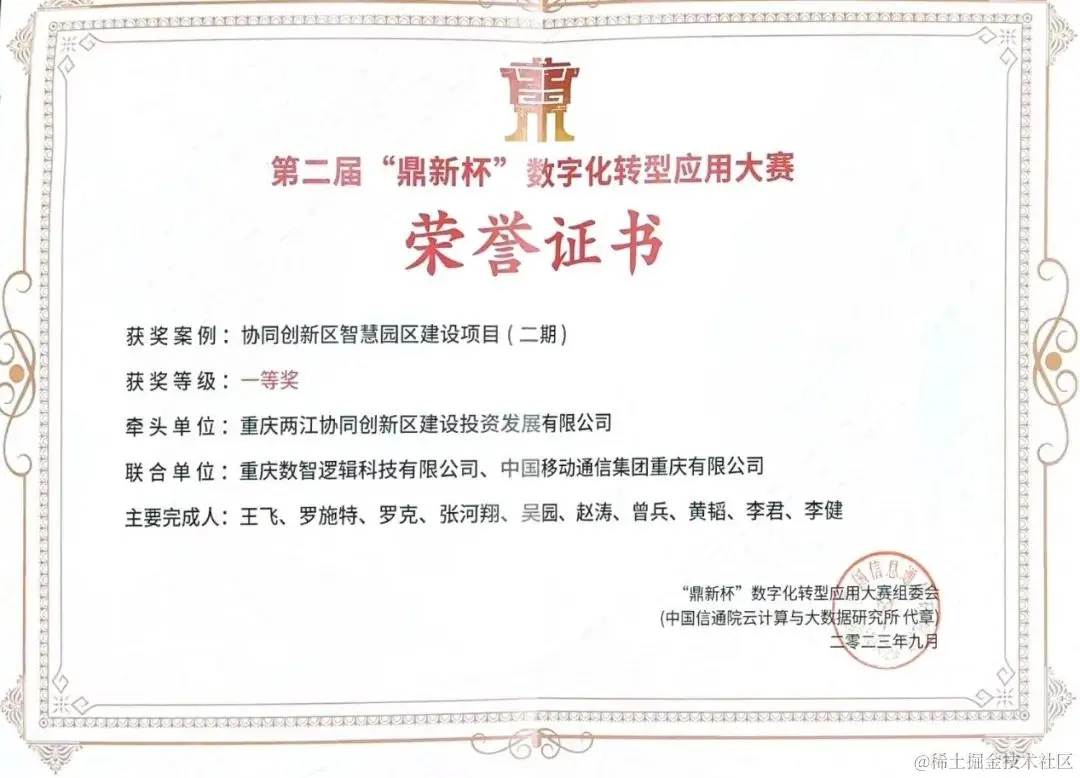 在“行业数字化融合方向-智慧园区”赛道,亚信科技旗下重庆数智逻辑联合重庆两江协同创新区建设投资发展有限公司、重庆移动打造的“两江协同创新区智慧园区项目(二期)”一举获得一等奖、行业标杆奖两项殊荣。图:“鼎新杯”一等奖