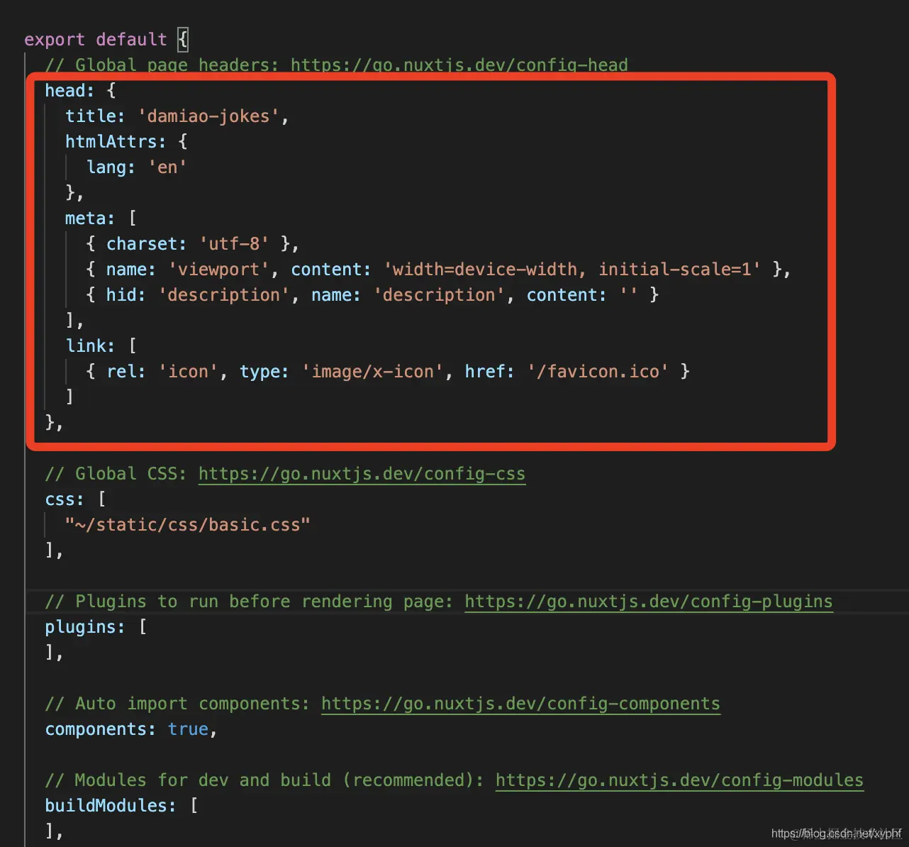 Nuxt服务端渲染-分别设置多页面Head标签内容 xyphf_和派孔明 2023-11-12 78 阅读1分钟 前面我们已经完成了对页面的开发,接下来我们来看每个页面的标签内容,我们发现这三个页面的head标签他是一致的,而且它和nuxt.config.js的配置是保持一样的,所以我们要对这三个页面的标签单独设置,更加方便与我们SEO的优化。 我们打开nuxt.config.js文件,找到head熟悉