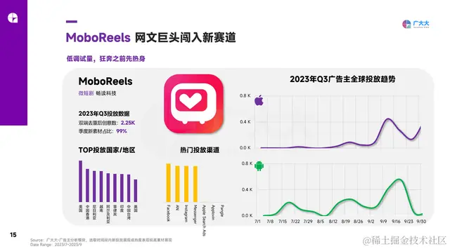 2023年6月,【MoboReels】正式在Google Play商店上架,但相比其他短剧竞品来说,其投放力度则明显较低。广大大抓取到其Q3双端投放素材仅2.25K,远远低于Flex Tv和ReelShort,应该是处于前期试量。从近期热门投放短剧素材我们可以看到该产品仍处于将国内短剧搬运到海外,并进行本地化翻译的短剧出海阶段。