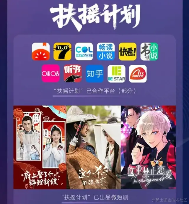 短剧出海虽然在今年正式爆火,但其实在几年前就已经有大厂尝试,其中“爱优腾”中的优酷在2021年推出了针对短剧孵化的“扶摇计划”,主要合作平台有我们经常在抖音刷到的七猫小说、快看漫画、书旗小说和知乎等,而畅读小说同样也在此列。