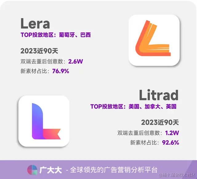 在短剧之前,畅读一直都深耕网文赛道,并投入众多,其繁体业务在海外华语地区长期处于图书畅销榜前3名,近几年更是着力发展英语、西语、葡语、法语等多种语言产品。根据广大大-广告主分析功能抓取到的数据来看,除了开头提到的两款主打网文平台外,最近主推的还有【Lera】和【Litrad】,两个产品在近90天投放的去重创意数分别为2.6W和1.2W,但偏重地区略有不同:前者主推葡萄牙和巴西,后者则延续之前网文产品路子主打“美加英”。