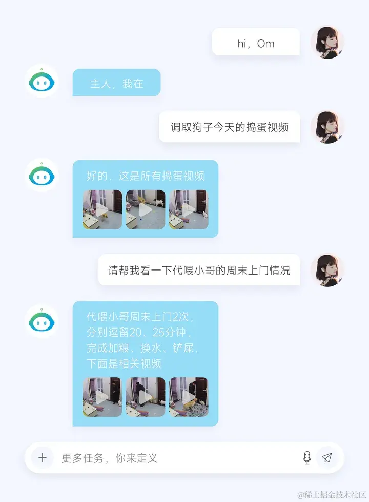 年轻的铲屎官无法时时刻刻地陪在 “主子” 身边,家里的主子有没有悄悄溜出门,家具拆的还剩多少,对新玩具还满意吗,有没有从未出现的异常行为需要留意,这些需求稀碎但也重要,传统摄像头及平台根本无法满足,通过 OmModel V3,铲屎官将可以通过自然对话定义属于你自己的任务需求,同时选择不同的反馈方式,可以是一份系统化的智能报告,可以是 AIGC 的视频合辑,反正结果也是由你用语言定义。