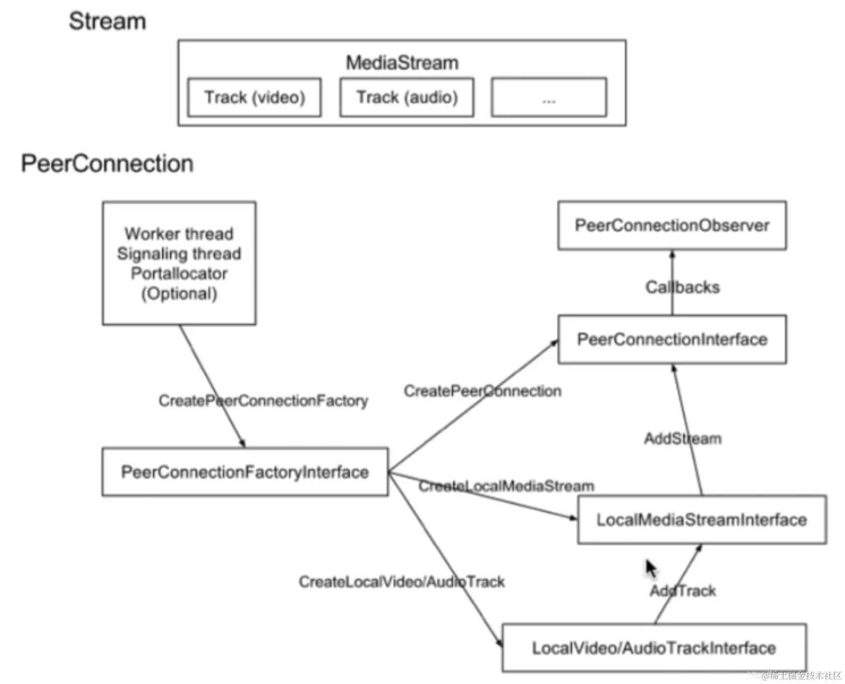 上图是从WebRTC官网截的,首先的是Stream流,也就是Media Stream,它包括了很多轨,包括了视频、音频……,当然也可以只有一路音频或者一路视频;接下来就是PeerConnection, Connection内部是有两个线程,一个 是Worker线程一个是Signaling线程,就是通过PeerConnectionFactoryInterface来创建两个线程,PeerConnectionFactory实际上就是个连接工厂了,他可以创造很多的PeerConnection,他不仅可以创建PeerConnection还可以创建MediaStream还可以创建LocalVideoTrack或LocalAudioTrack,创建之后首先是创建一个一个的轨,然后通过AddTrack将他们添加到MediaStream媒体流中去,那么可能有多个媒体流,最终都通过AddStream添加到PeerConnection中去,他们复用的是同一个连接,同一个Connection,当然在底层的话有可能是不同的路,那么在这里要注意的是什么是多个Stream,那么我们都清楚在我本机有可能有音频和视频,我塞到一个Stream里面去,那这个就是为什么一路会有多路Stream,那就是有可能是与多方通讯,那么每一方实际就是一个Stream,想想一下在一个音视频会议中,能有三方进行视频通讯,那么每一方就是一个Stream。