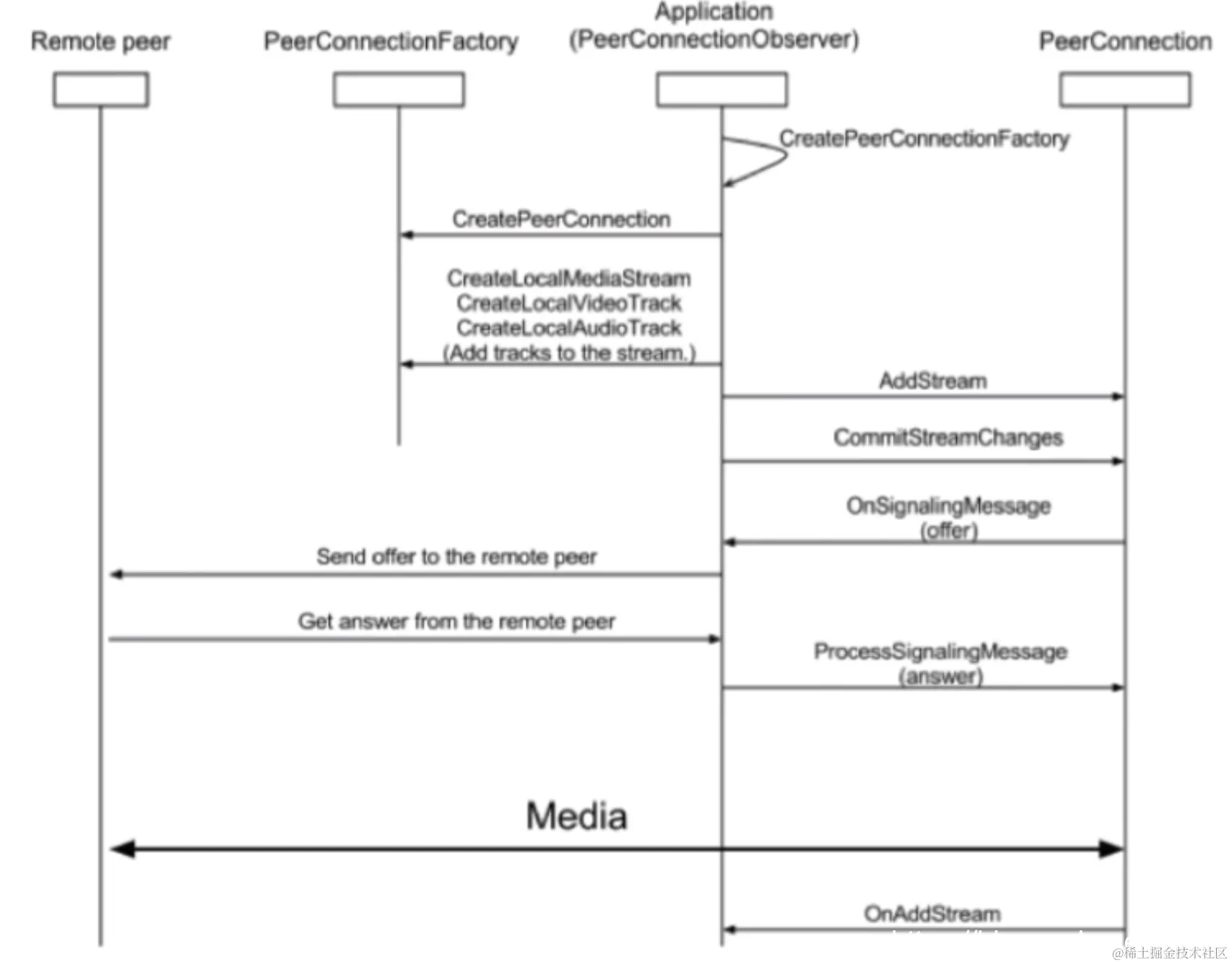 首先是应用层会触发CreatePeerConnectionFactory,这样就创造出了PeerConnectionFactory这个工厂,那么这个工厂呢又触发了CreatePeerConnection,然后又创建了一个PeerConnection连接,这个工厂还会创建CreateLocalMediaStream、CreateLocalVideoTrack、CreateLocalAudioTrack这个轨,然后在通过AddTrack将这些 轨添加到Stream中去,添加完了之后在调用这个AddStream将这个流添加到PeerConnection连接中去,流提交好了之后会提交这个流的变化CommitStreamChanges,当这个流触发变化的时候,就会触发这个事件创建一个offer 的SDP的描述信息,有了这个描述 信息之后呢,通过应用层通过信令发送到远端,在这一端 收到这个offer SDP,SDP里面包括的信息有包括哪些视频哪些音频以及音频格式是什么视频格式是什么?你的传输地址是什么?这些信息实际就度过来了,根据这些信息远端会回一个answer给这个信令,信令与 我们媒体流的信息实际上是两条路,并不是通过TCP传输的,他是通过UDP传输的,那么这个信令收到这个answer之后就会传给这个connection,那这个连接就拿到了对方这个媒体流信息以及它的传输端口、传输地址,那么这样他们之间就打通这个通道了,可以相互的传这个媒体数据了,当远端的数据来了之后,这个Connection还会将远端的这个流添加到这个APP中去,那么APP它本身也是一个ConnectionObserver,这是一个观察者,其实要知道这个连接发生了哪些事件,那么通过这样一个时序图我们就了解了整个API的一个调用过程,那么以上呢就是我们整个webRTC的一个运行机制,大家有任何问题的话,可以在下方评论。