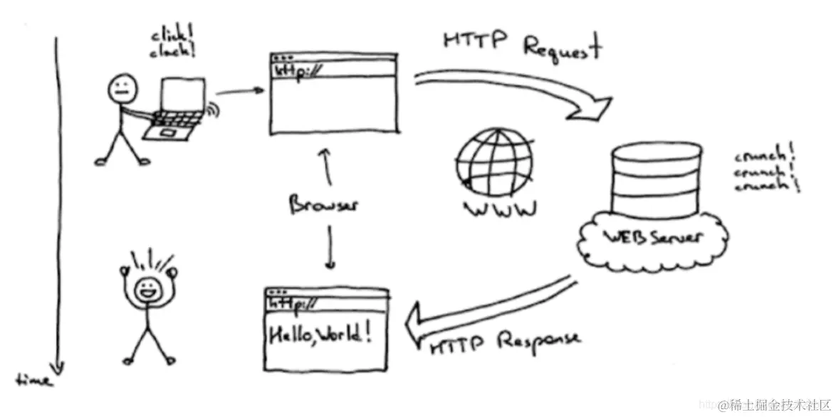 首先我们通过上图看出有个人通过浏览器敲入http,点回车那么这个请求就被浏览器发送给力web服务,就发送 了一个Http Request,这个后端服务呢,一般是挂着一个数据库,它需要做很多的逻辑处理,处理完之后,会给浏览器一个响应,就是Http Response,拿到这个响应之后实际是一个HTML的页面,就会将这个Hello World显示出来。