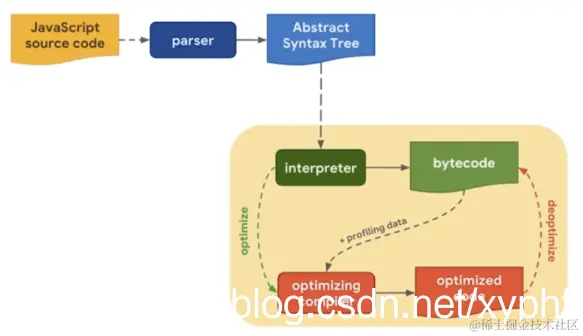 首先我们看看JavaScript解析是怎么解析的,首先是这个V8引擎它会收到JavaScript的源程序,我们在服务端要实现服务的话首先 是写一个JavaScript的小的脚本,通过V8之后生成这个parser,解析之后生成JavaScript的函数,最终交给这个解析器,解析成bytecode,就是这个支撑代码,还有可能先进行优化,然后形成优化后的代码,最后在转换成optimized code,我们首先大体的了解运行过程就可以了,具体的细节不是我们这里所要说的。