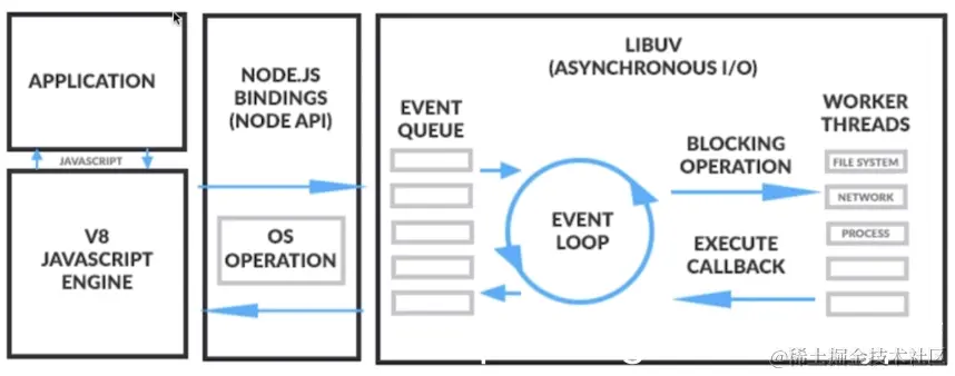 首先是APPLICATION,也就是我们自己开发的JavaScript程序,他首先会输出给V8引擎,这个V8引擎大家都非常清楚了,是从chrome的项目中抽取出来的,主要对JavaScript进行一些解析工作,解析完之后生成一个二进制代码;接下来是NODEJS本身他自己的一些API,解析后的二进制代码去调用NODEJS API,这里称为NODE BINDINGS,调用之后NODE JS还会调用LIBUV的事件处理库,它的工作原理是一直循环等待事件处理,请求过来的时候会首先插入到事件队列当中去,事件循环就不断的从事件队列里面去拿一个个事件,最后去做相应的处理。这个就是NODEJS的工作原理,重点是他有这个V8引擎 。
