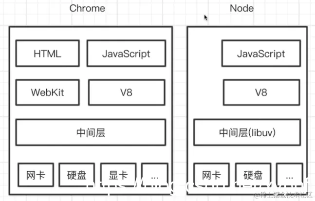 再接下来我们再介绍一下V8引擎,实际在我们使用NODEJS之后,有时候会给大家一种困扰,我的服务端也是JavaScript,客户端也是JavaScript,什么时候是服务端的运行什么时候是客户端的运行,那实际是有两个V 8引擎,如下图所示: