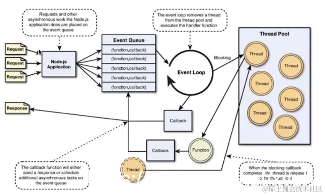 接下来我们再看nodeJS的工作原理,如下图就将整个工作的情况给我们大致梳理清楚了。
