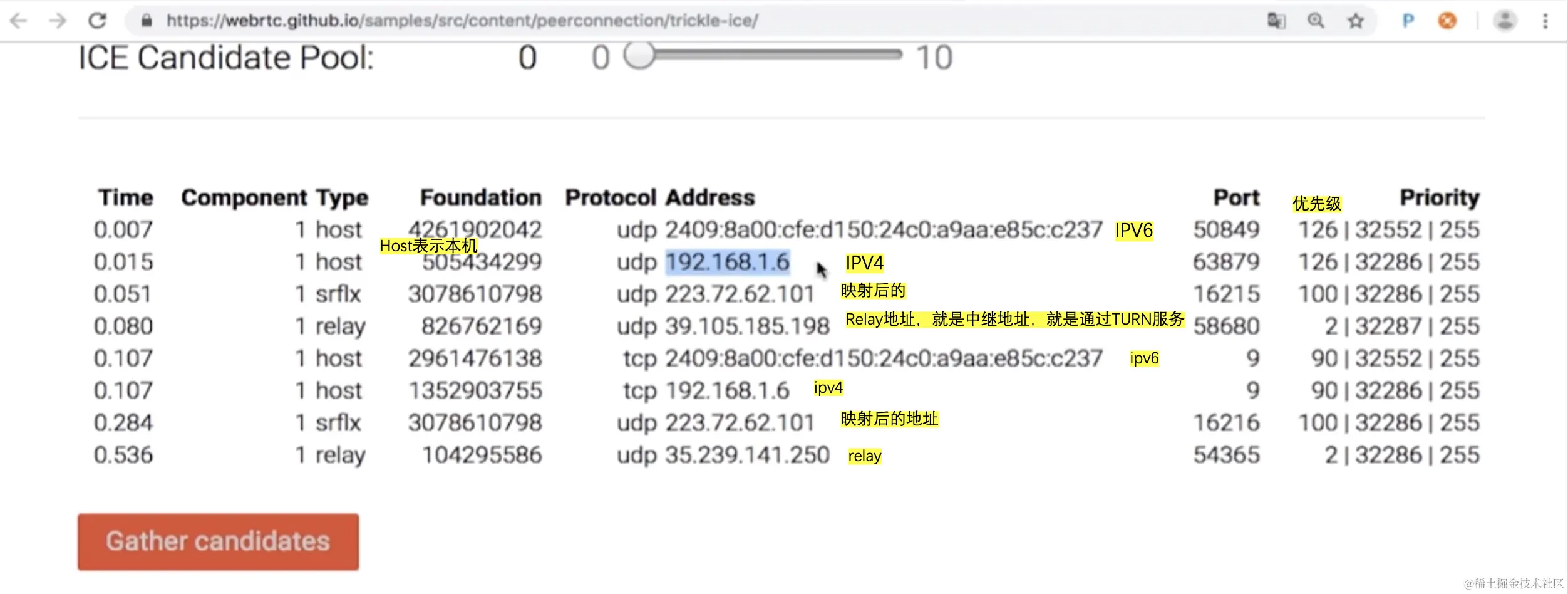 下面我们点击一些Gather candidates按钮,这里可以选择的ICE类型有两种,all表示对所有的candidate都收集,relay表示只收集relay