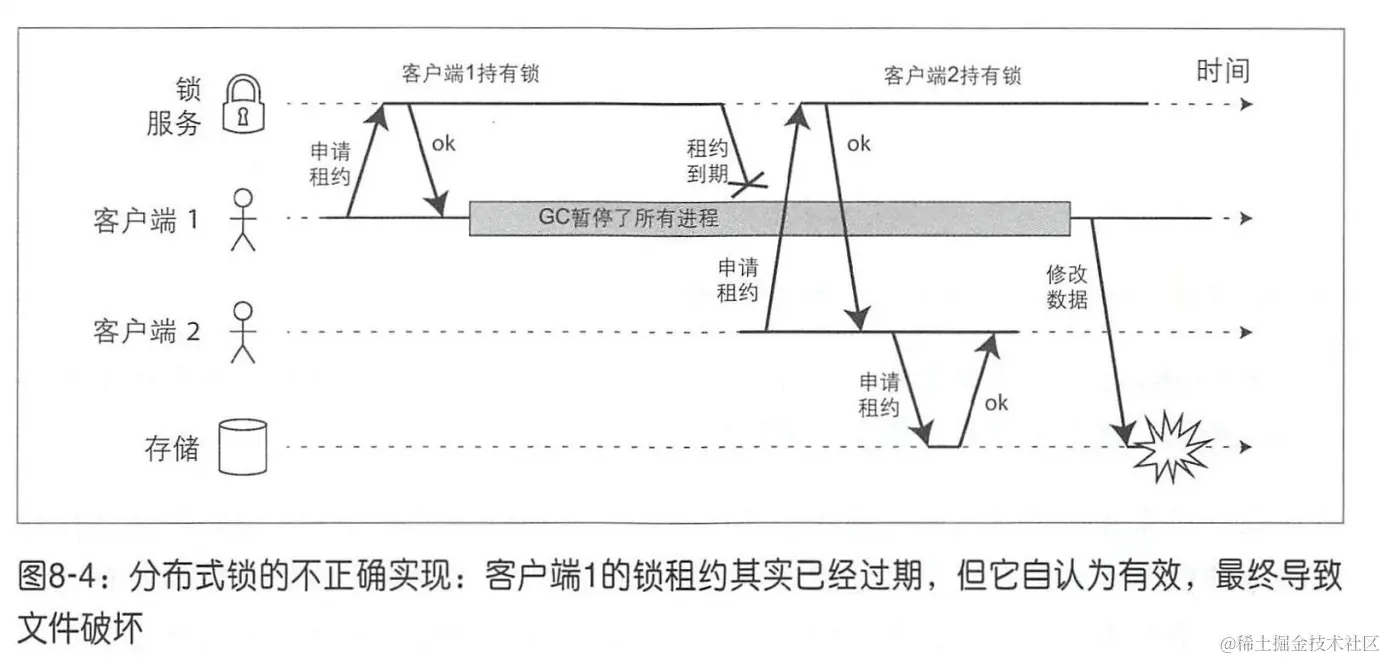 前面小节“进程停顿”中其实讲到了这么做会导致的问题:如果持有租约的客户端停顿了过长时间,以至于租约过期。此时,另外一个客户端向锁服务请求并获取到同一个文件的租约,然后开始写文件。当前一个停顿的客户端恢复时,它想当然的认为自己仍然持有租约,也开始写文件。此时,这两个客户端的写入可能会产生冲突并导致文件的数据损坏。