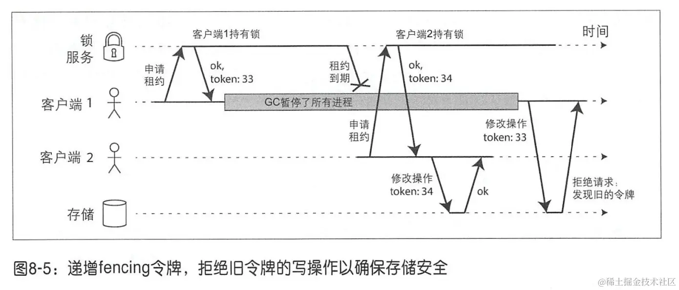 如上图,客户端 1 获得了一个关联了令牌号 33 的租期,但随即经历了长时间的停顿,然后租约过期。客户端 2 获得了一个关联令牌号 34 的租期,并且向存储服务发送了一个附带了该令牌号的写请求。稍后,当客户端 1 结束停顿时,附带令牌号 33,给存储服务发送写请求。然而,由于存储服务记下了它处理过更高令牌号(34)的请求,于是它就会拒绝该使用令牌号 33 的请求。