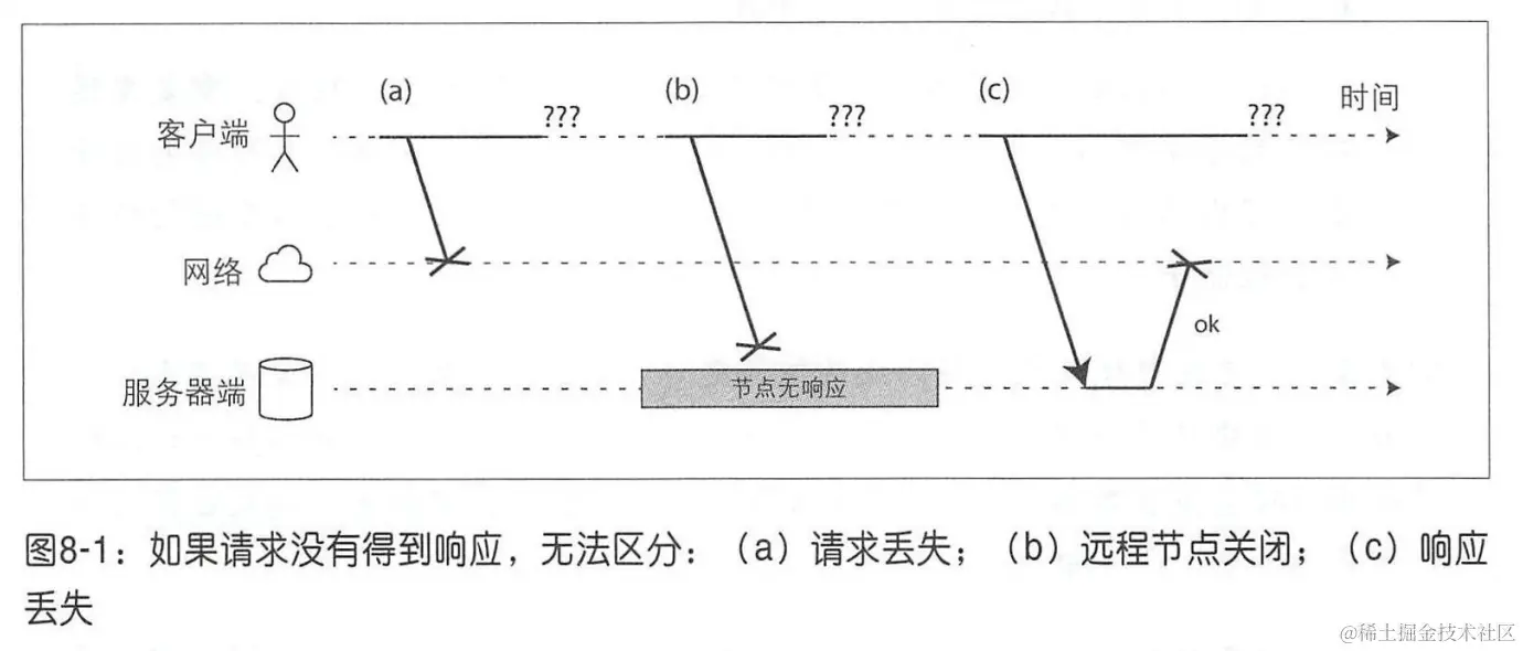 互联网及数据中心的内部网络多是异步网络。在这种类型网络中,一个机器向其他机器发送数据包时,不提供任何保证:你不知道数据包什么时候到、甚至不知道它是否能够到。具体来说,当我们的应用发送网络请求后,可能会面临以下诸多情况: