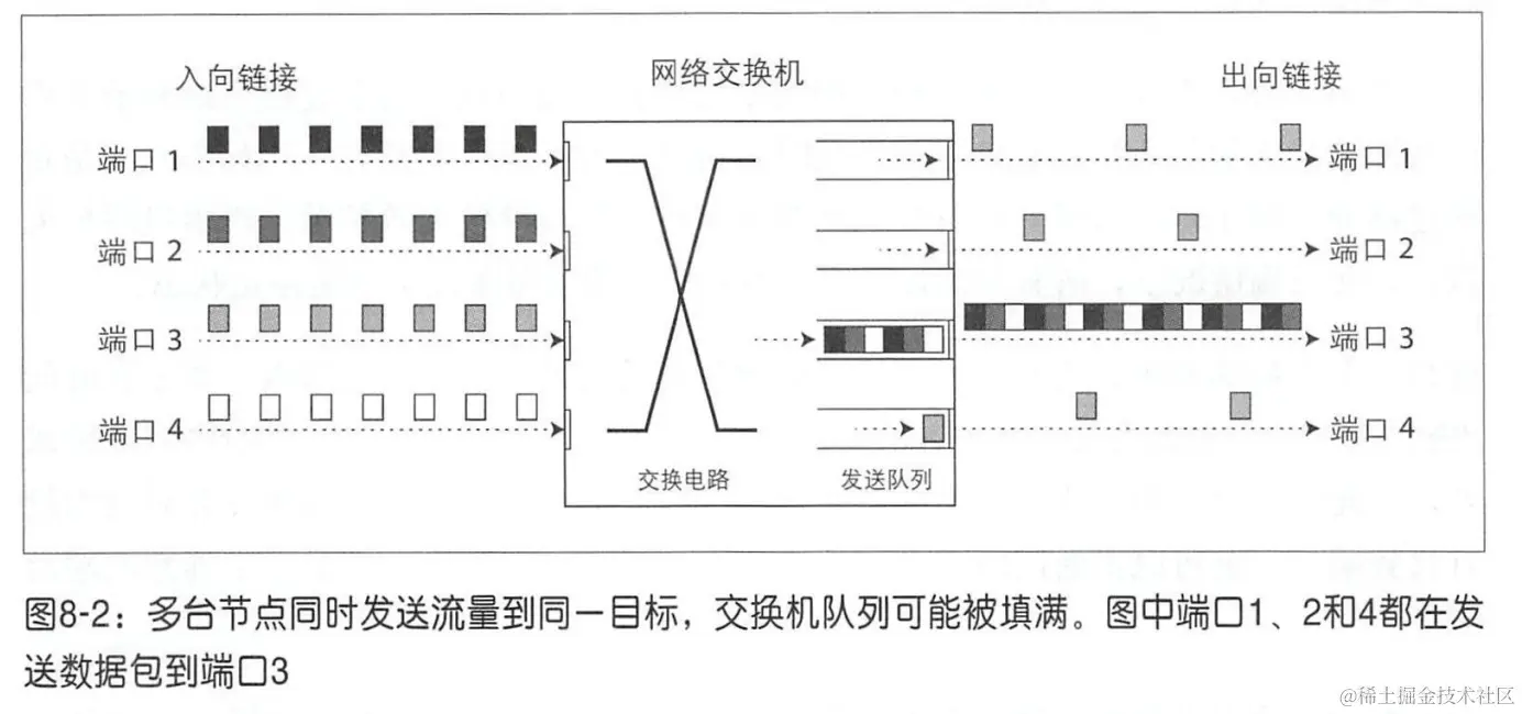 - 去程网络排队。如果多个节点试图将数据包同时发给一个目的端,则交换机得将他们排队以逐个送达目的端(如上图)。如果流量进一步增大,超过交换机的处理能力,则其可能会随机进行丢包。