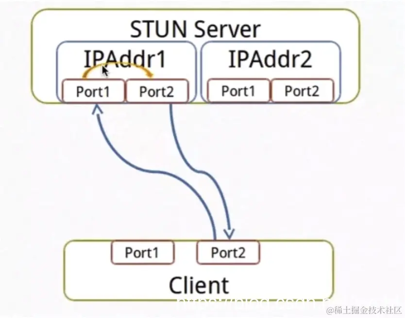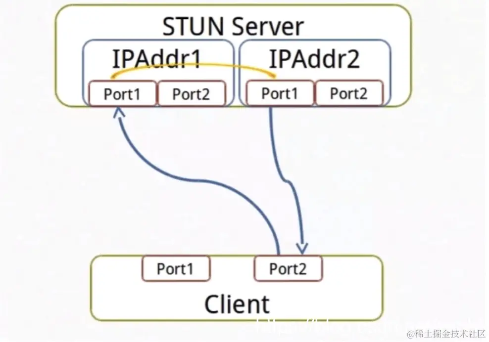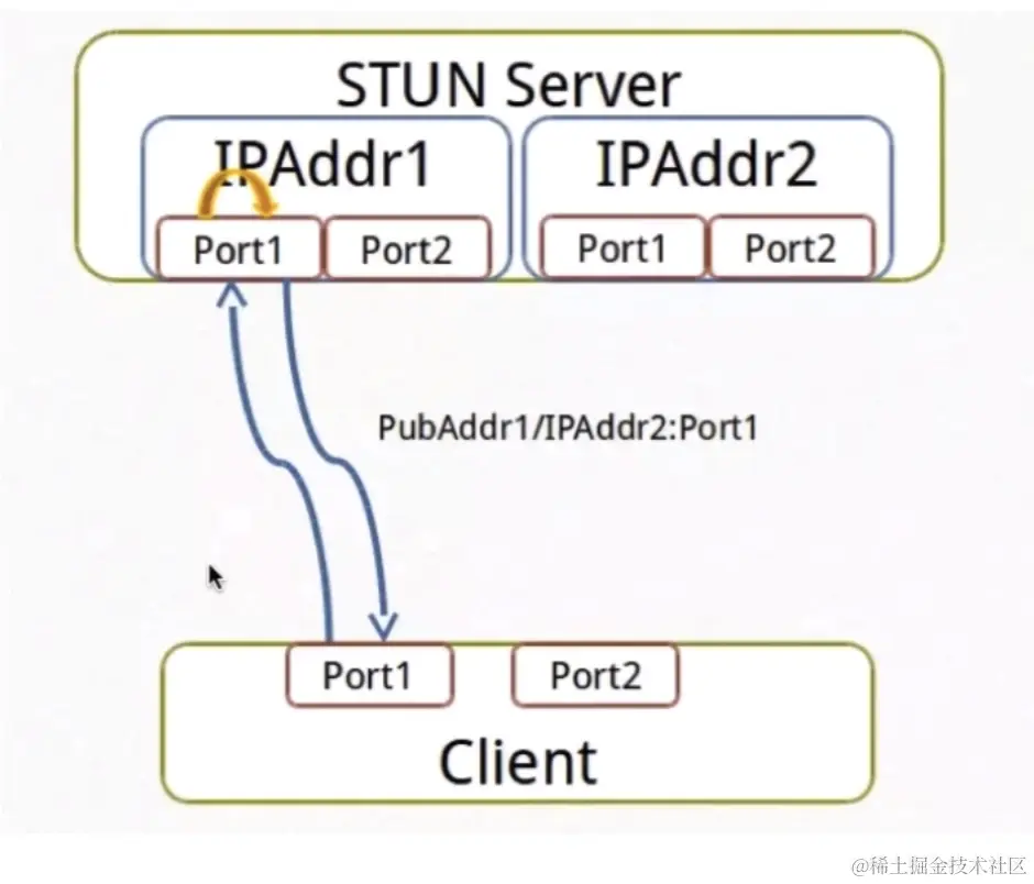 首先是我们的客户端,通过第一IP地址和端口,发送一个请求过去回来一个响应,如果回来这个地址和 我们之前发送的地址是一致的,那就是公网的。如果不一致说明我们是在NAT之后,这是第一次检测。
