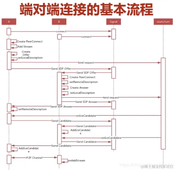 那以上就是一个基本的端对端连接的基本流程。那经过这样一个分析大家就会清楚,整个A要与B进行通讯,要走几步,从大的方面讲,首先是媒体协商部分,就是上面这一块,紧接着是候选者的交换与连接检测部分,最后一部分是媒体数据流的通讯部分,也就是分成这个三大块,熟悉了这个基本的流程之后,我们再编写这个程序的时候,就非常的简单了。我们只要按照这个步骤一步步的 操作那么就能实现两个端之间的通讯。