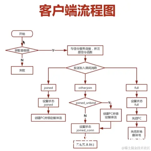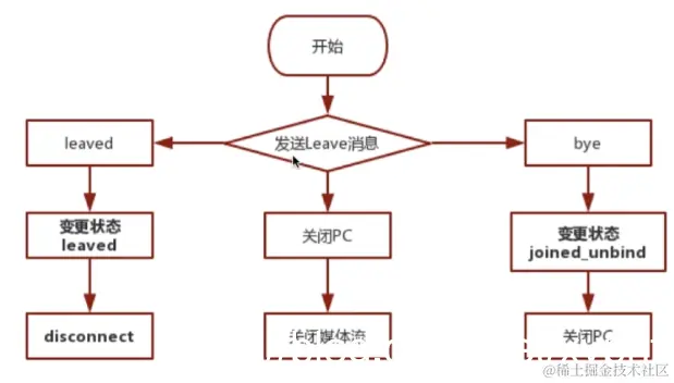 另外还有消息呢,就是还有这个leave消息,就当离开的时候把它分成两个,一个是当我发送本身自己想离开的时候,收到服务器端确认已离开的消息的时候,那这时候它变成了leave状态,已经初始状态,这时候关闭连接就好了,OK。但如果他是主动的发起方,他发起的时候其实他要做一部分工作,他就说叫我现在已经有了这个PeerConnection,只要关闭掉,然后呢,关闭这个音视频设备,也就是媒体流。再一个呢,就是跟对方说byebye的时候,当你收到对方说byebye的时候,那这时候你就变成了join_unbind状态,同样也要关闭对应的peerconnection,那在关闭之后另外用户再加入的时候,让你收到otherjoin这个消息的时候又会重新创建PeerConnection并进行绑定。这就是客户端的基本流程,就是它分成了两部分,第一部分呢是跟加入相关的,一是成功,另外是接触到对应的用户加入,还有什么房间加入已满?第二个是跟离开相关的,一个是这个自己发送离开这个逻辑,然后呢,刚才已经处理完了退出来,你要变更状态,还一个呢,收到其他人的离开的时候,你要做相应的状态的变化以及相应的逻辑处理,OK,这就是客户端的一个基本流程,那接下来呢,我们再回顾一下之前所讲的端对端连接的基本流程。