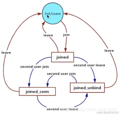 当一个用户处于joined的状态的时候,另外一个用户又进来了,这个时候它就变成了joined_conn状态,也就是说加入并且可以与对方进行通话的状态,这对于房间里已经存在的这个人,它的状态就发生变化了,这个变化就是通过otherjoin消息通知的,当他收到otherjoin的时候它就改变这个状态,对于后加入这个人,它还是处于joined这个状态,因为它自己并没有收到otherjoin这个消息,所以房间这两个人其实是两个不同的状态,第一个人是先加入的是joiner_conn状态 ,那么后加入的是join状态,那对于join_conn这个状态的用户它也可离开,当他离开的时候它也处于初始化或者离开状态,这也是没有任何问题的。