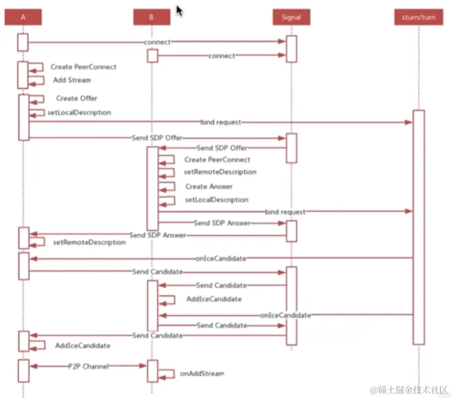 首先是A与B进行通讯,首先进行信令的连接,连接完了之后整个信令就打通了,对吧,那么这个时候他要创建链接,并且将重新音视频设备加入到这个PeerConnection里去,做一次绑定,绑定之后就开始整个的媒体协商,创建Offer,setLocalDescription,那这个时候呢,会触发收集candidate,创建完Offer之后,通过信令然后转发给这B端呢,B端呢,B端也要做相应的创建连接,设置remote description,创建Answer一系列操作,最终也要出发去收集这个candidate,通过信令再回来,交给A端,那么A端最终设置一个setRemoteDescription,这样整个协商部分在这块就完了,完了之后呢,就开始收集这个candidate,进行这个candidate的交换,我们信令中都有专门的这个message,就是做中转的,端对端的中转,将双方的candidate进行交互,添加到自己的列表里面进行连通性检测,整个中间这块儿就是对于整个候选者的这个数据检测连通性,OK,那么这完了之后,整个数据通道就打通了,就开始传数据,当A向B发送数据的时候,B收到一个事件,叫onAddStream或者onTrack,说到这个事件的时候,将底层的远端数据直接添加到本地的这个video标签里去,就能将远端的数据反映出来音频视频,以上呢,就是我们客户端的整体的状态机的变换,主要流程以及分离到连接的一个基本过程,OK!