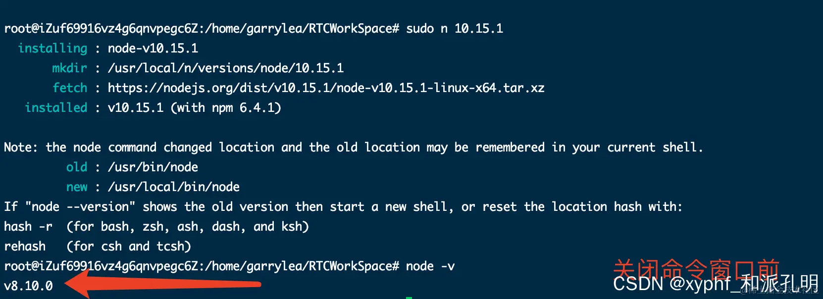 一定要关闭当前命令行窗口后,再次打开命令行窗口,输入node -v检查更新后的版本。