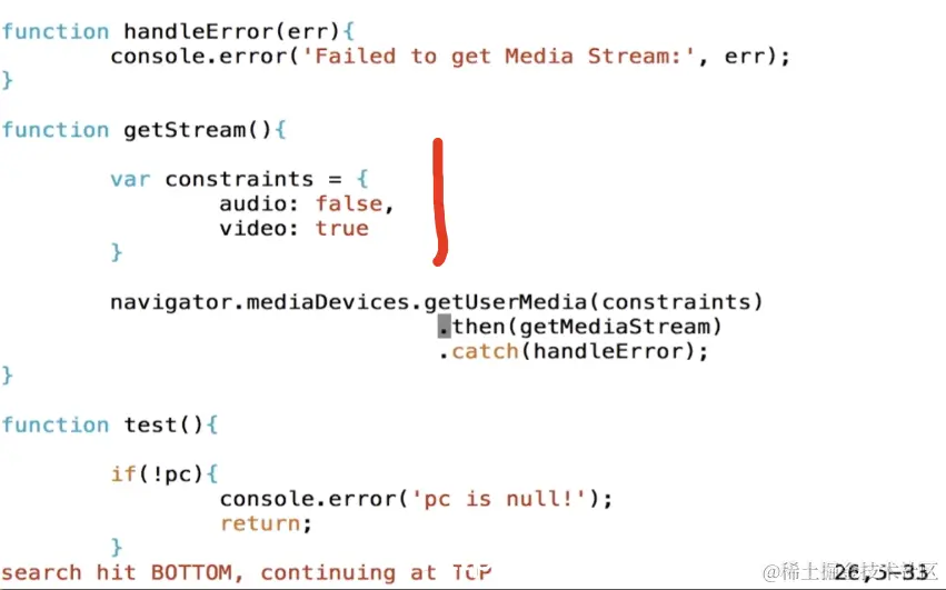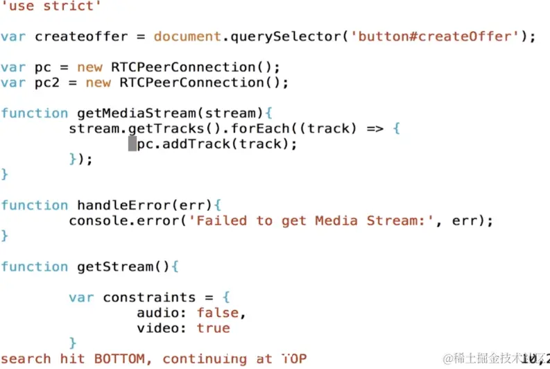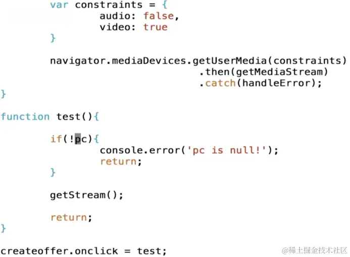 我们在js上做一些功能的增加,在这里首先是当用户点击createoffer的时候会触发一个时间,也就是test,那么在test里面对这个PC做了一个验证,就是我们这个连接,这时候我们去getStream,那从这个音视频设备中获取视频设备,这里我们将音频关了