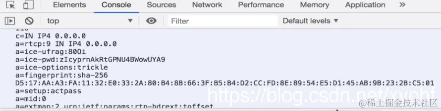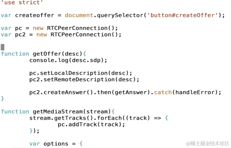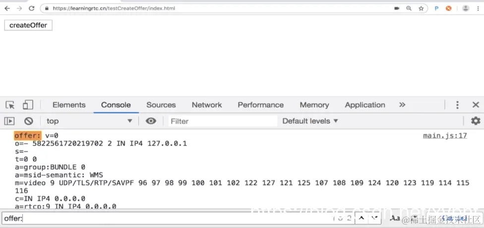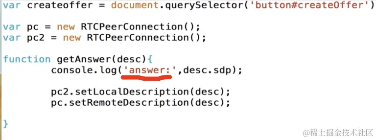 紧接着我们就来实现这个getOffer方法,创建Offer成功之后他会穿进一个desc参数,当我们拿到这个desc之后通过console.log将这个desc打印一下,这就是我们创建的SDP,