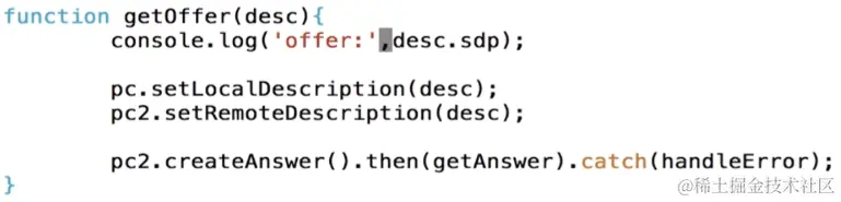 那因此还是要实现getAnswer,getAnswer也同样的会有一个desc参数传进来,当我们收到这个desc的时候我们将这个SDP打印出来,这个时候首先是pc2调用setLocalDescription,这个时应该发信令给远端,这时候pc收到之后它要设置setRemoteDescription,那么这样整个协商过程就完了