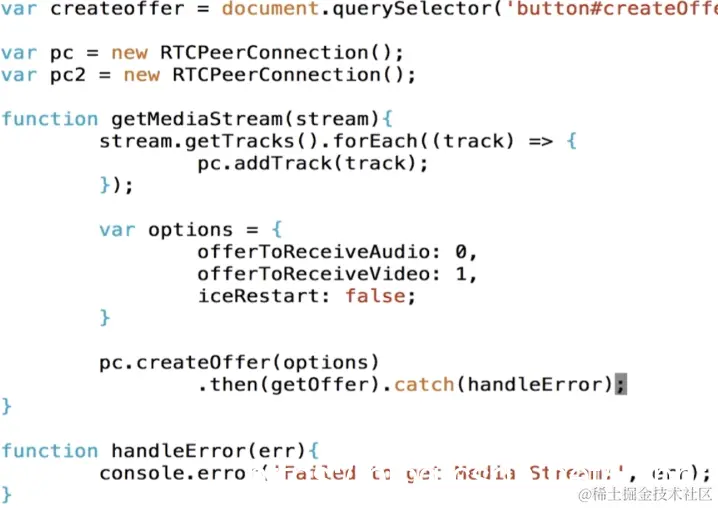 那在这个函数里会将获取到的所有的音频和视频track,添加到pc中去,那么这时候这个pc里就有了视频的track,那有了这个之后我们再创建Offer的时候,那实际就有了新的媒体描述信息就是video,如果有音频就是audio,现在我们就实现媒体协商这部分,首先是pc.createOffer(),那么在这个createOffer里写一些这个options,现在我们第一步先让这个restart先为false,