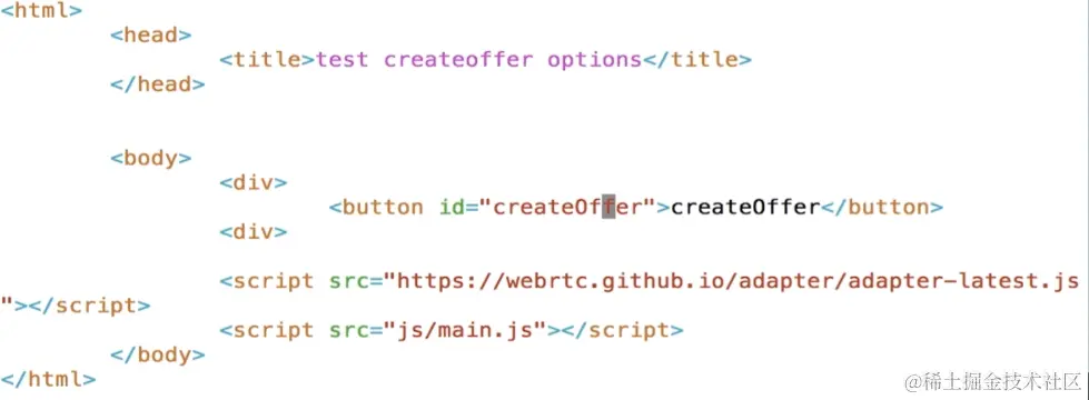 在这里我们有一个基础了,也就是testCreateOffer,这里有两个文件一个是index.html一个是js,首先我们看一下index.html