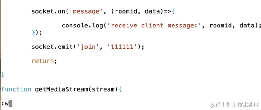 这样我们就完成了所有函数接收消息的注册,那下面我们就要发送这个消息,当我们建立这个连接之后,我们要发送一个join,后面111111是房间号,这样就完成 了我们建立连接之后我们首先从服务端接收消息注册,消息来的时候就会对他们进行触发,另外接收了消息我们紧接着发送一个消息join,加入的房间是111111,当然更好的写法是我们可以在界面层去控制 ,我们可以让用户输入一个房间号,我们现在为了实现方便,我们就写111111就好,这个时候我们就返回return。