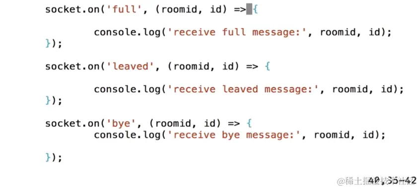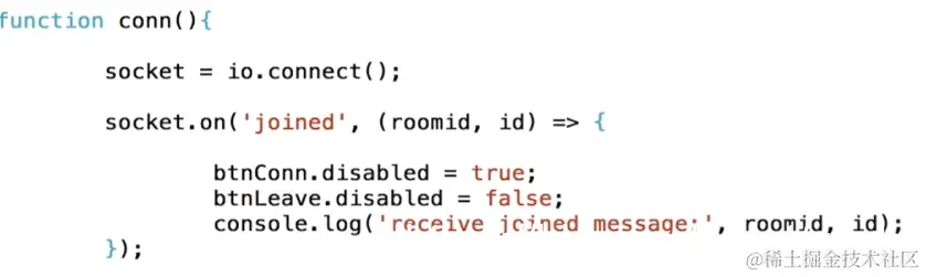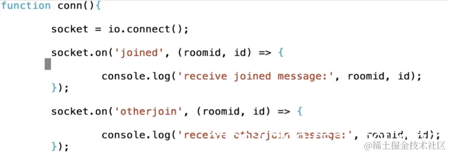 第一个就是joined,当客户端发送一个join的时候那服务端会回一个响应,那这个时候我们就能拿到join,那它回来的时候实际是带了两个参数,一个是roomid一个用户id, 所以这个是和服务端所匹配的,这样我们joined方法就算注册成功了,这里具体逻辑没有写后面我们将它补上。