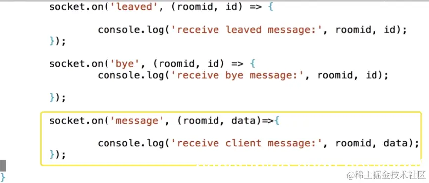 紧接着我们要接收一个消息,就是做一个端对端的,就是当其中一端发送Offer和Answer和Candidate消息时候,通过服务端去中转,那这时候我们也要监听这个message,在message里我们也有两个参数,第一个是roomid,第二个是data, 这个数据实际服务器端不关心,要有我们这个客户端去做相应的处理,