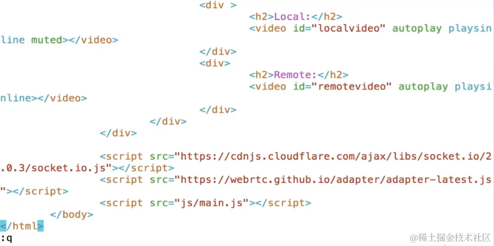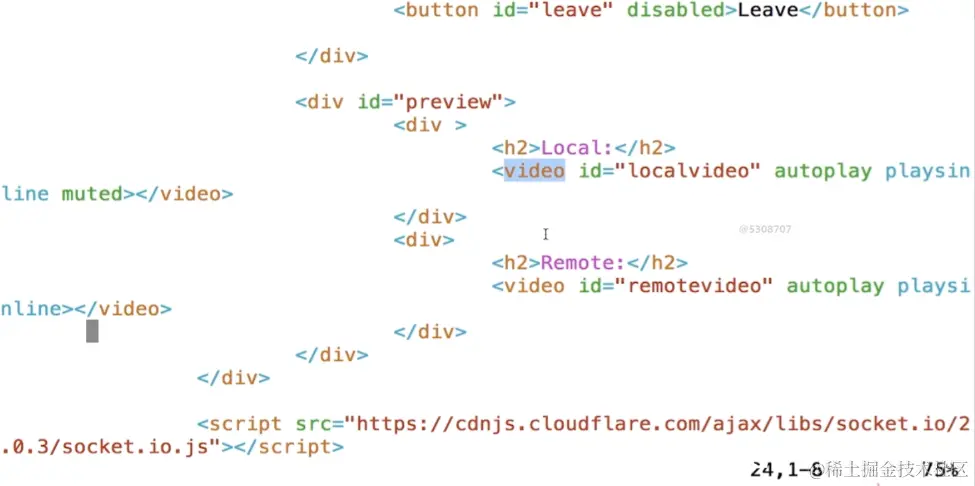 那另外是有两个视频video标签,第一个是展示localvideo的,也就是说我们从音视频设备中获取的数据可以在这个localvideo标签里展示,另外一个remotevideo是远程的这个标签,远程的这边标签就是当我们整个通讯都连接好了之后,协商已经好了,通道连接性检测也检测完了,数据开始发送了,这个 时候我们从远端获取的音视频数据,那么会从这个remotevideo标签里展示出来。ok
