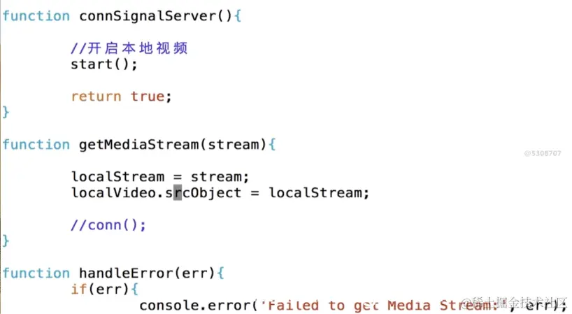 获取到视频之后我们会通getMediaStream来获取到流,拿到这个流之后我们就可以将它设置到localVideo这个视频标签里,通过srcObject,这样我们本地的视频就能展示出来,我们