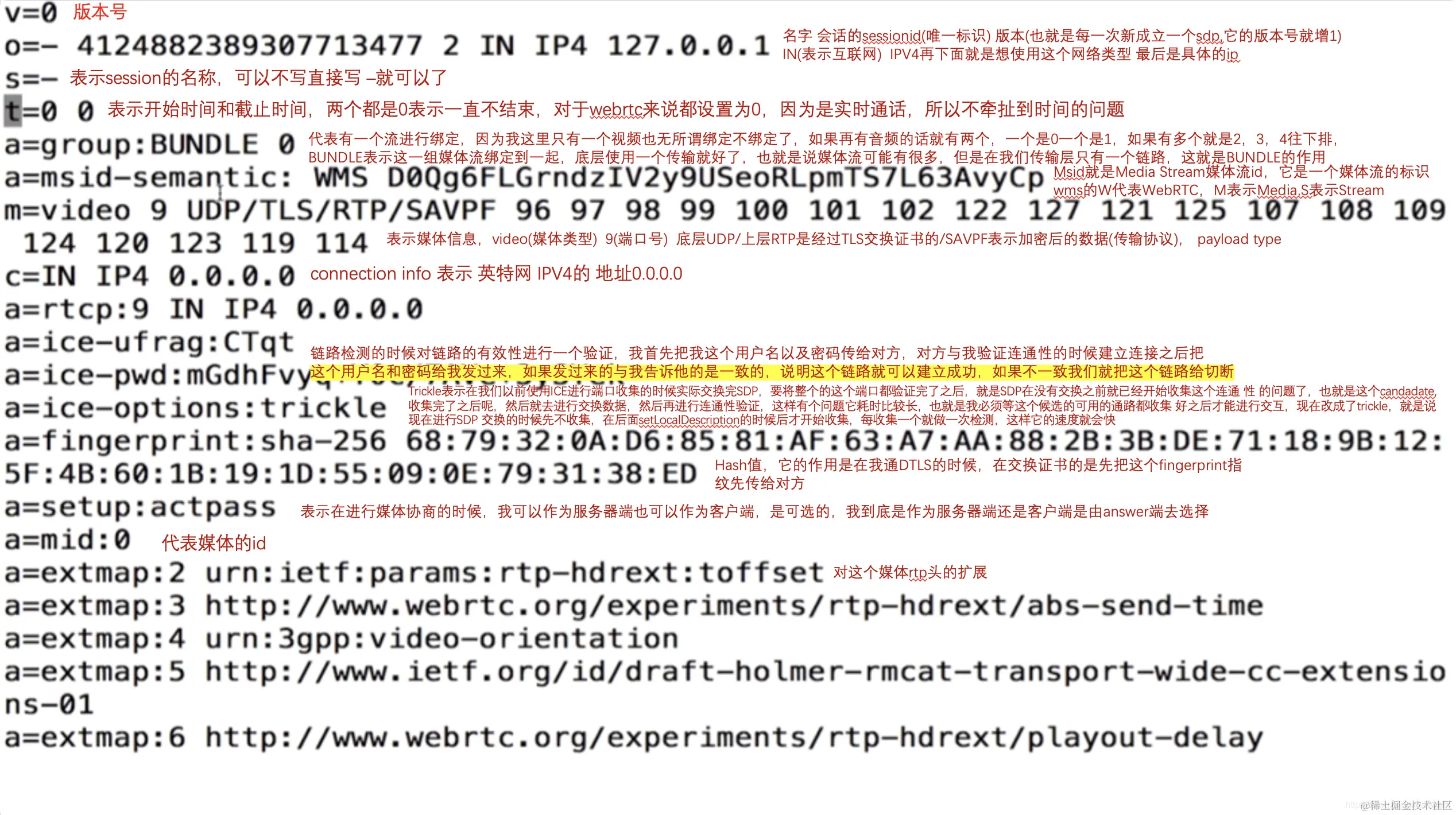 会话层呢,主要包括了一些这个会话的这个名字啊,目的还有这个时间呢,媒体层呢,就是一个媒体音频视频。那么在媒体层呢,又可以通过attribute属性来去对媒体作进一步的说明,这个呢就是这个SDP的规范,那么紧接着呢,我们又介绍了WebRTC中如何使用SDP的,不知道大家还记怎么记得他一共是五大项,包括了会话、网络、服务质量、加密,还有一个是这个媒体就是流相关的,对吧,一共是五项,那大家对这一块儿一定要好好看一看,这五项每一项都非常关键,要除了会话以外其他四项都特别关键。