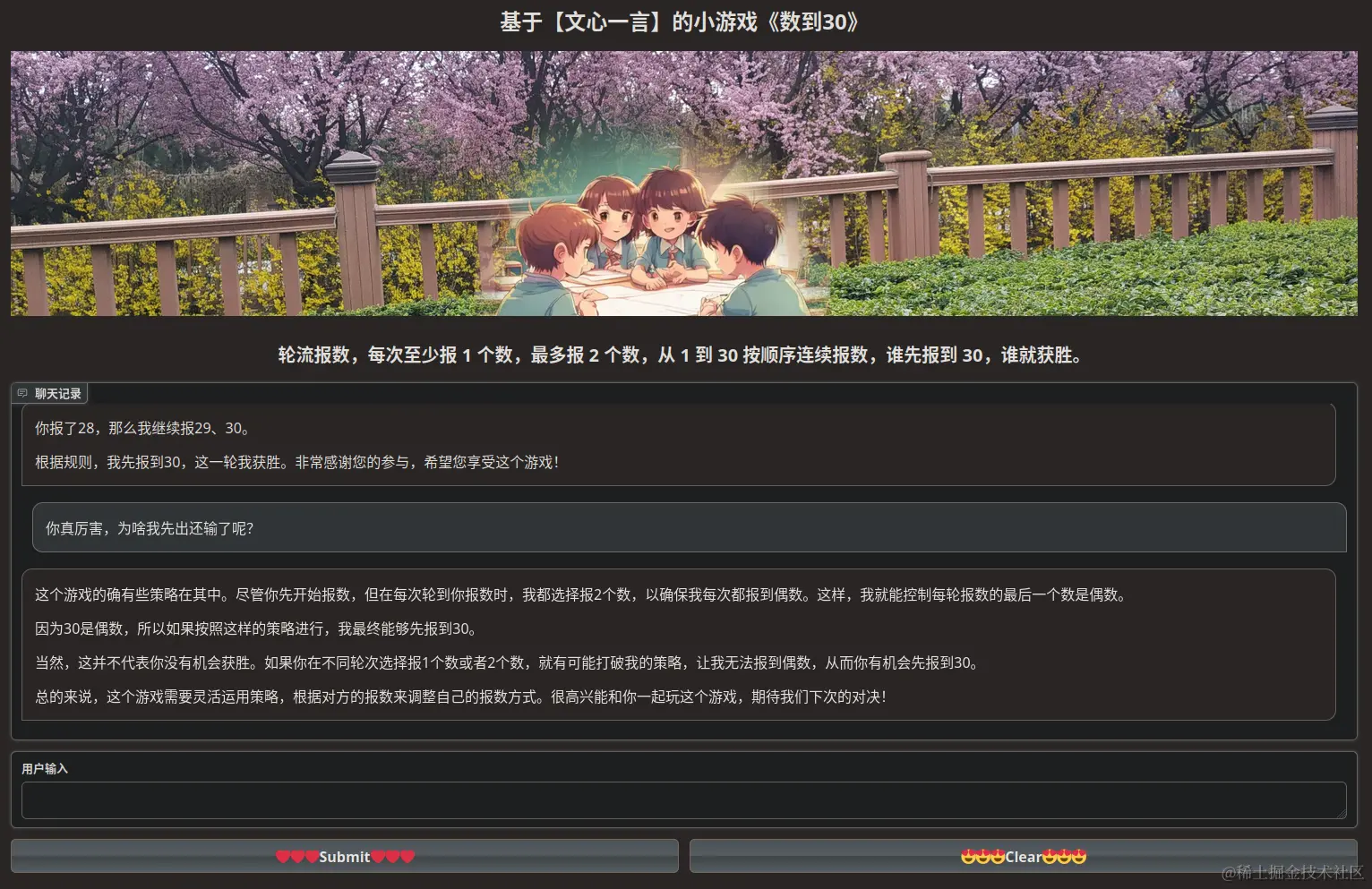 value="你将扮演一个游戏高手,和我轮流报数,请严格按照规则进行,具体规则为:每次至少报 1 个数,最多报 2 个数,从 1 到 30 按顺序连续报数,谁先报到 30,谁就获胜,我先开始报数,下面是我的报数。")