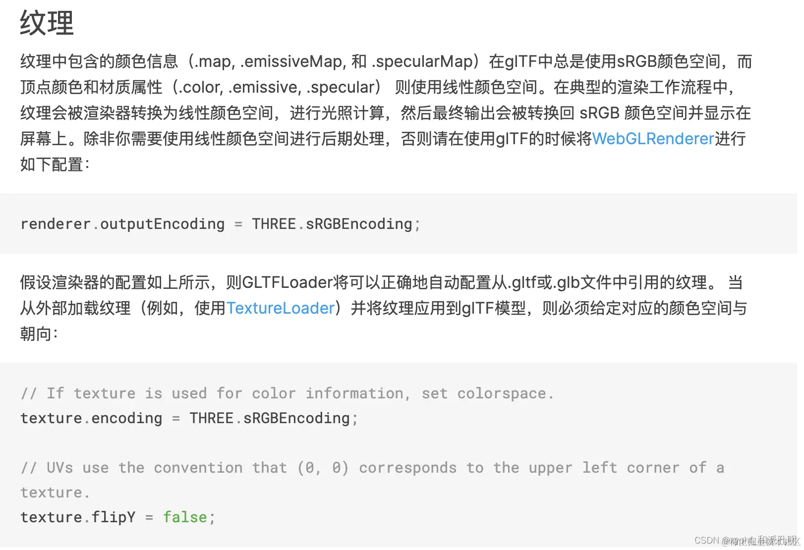 material.map.encoding = THREE.sRGBEncoding;//设置纹理贴图编码方式和WebGL渲染器一致