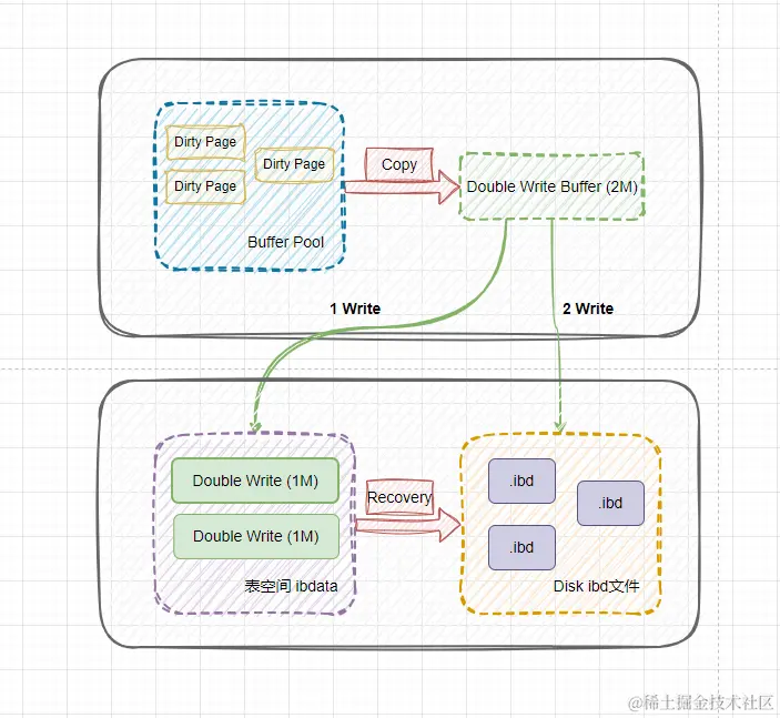 我们可以看到 Double Write)由两部分组成:内存中的 Double Write Buffer 和 磁盘上的 ibdata1的两个区(连续的128页,2M大小)