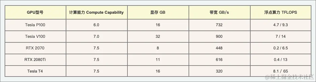 这里还有个误区,对于刚了解 GPU 的来说,可能会想当然地认为:GPU 计算能力越高,那么它的算力也越高、性能也越好,这个想法是非常危险的。罗列一组 GPU 参数性能数据对比进行说明,如下,