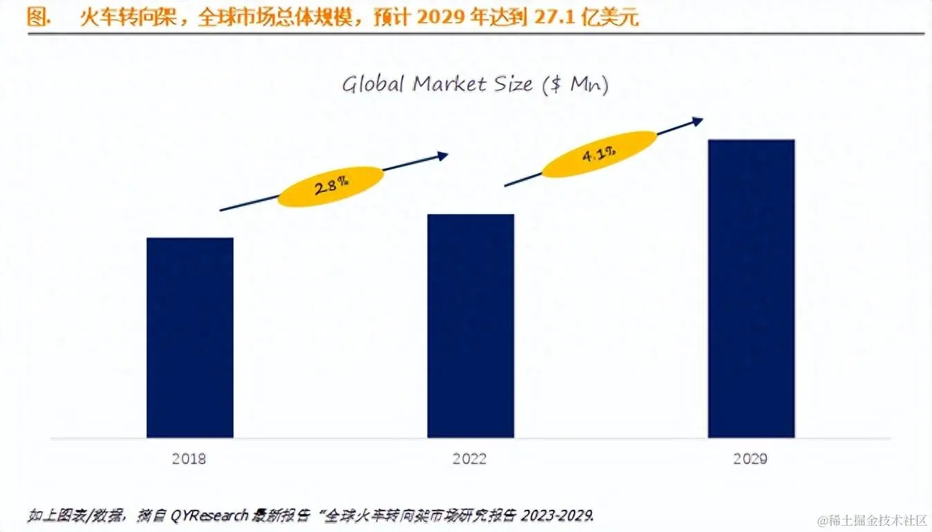 据QYResearch调研团队最新报告“全球火车转向架市场报告2023-2029”显示,预计2029年全球火车转向架市场规模将达到27.1亿美元,未来几年年复合增长率CAGR为4.1%。