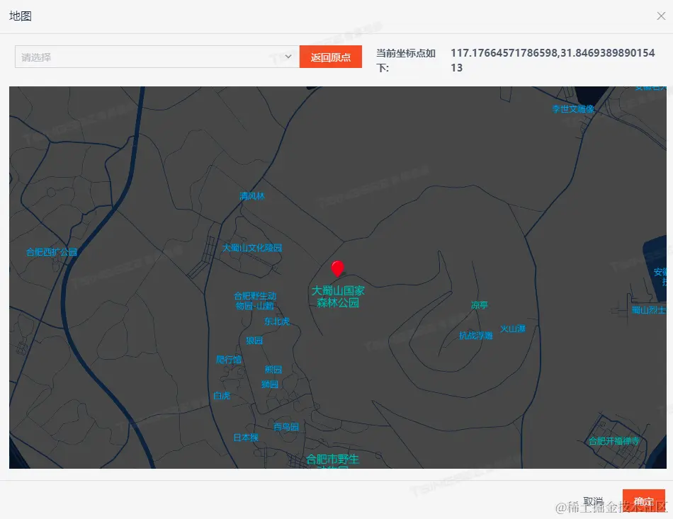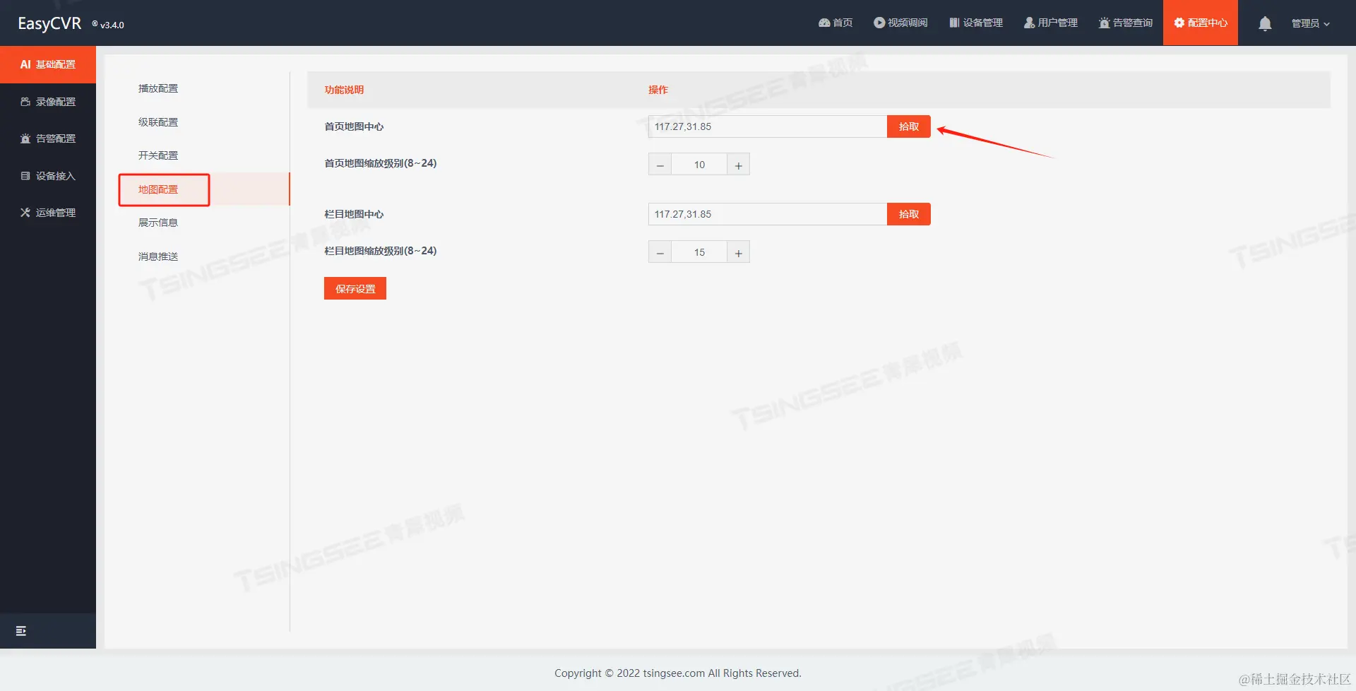【配置中心】做了进一步的功能划分,目前包括<基础配置>、<录像配置>、<告警配置>、<设备接入>、<运维管理>。对于首页和栏目里的地图,新增级别缩放,在中心点配置,支持在线拾取: