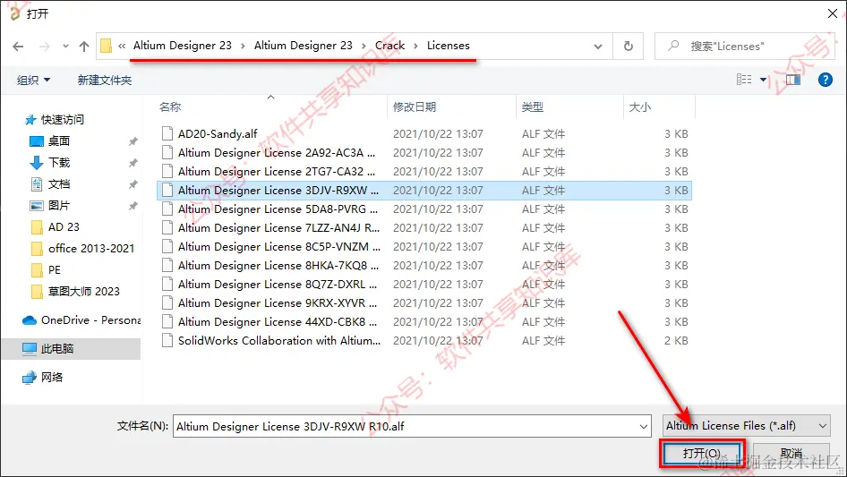 17.选择解压后的文件夹,打开Crack\Licenses文件夹,选择任意一个文件,点击“打开”。
